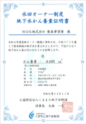 米作りを通じて水田と地下水の保全に参加する取り組みです。企業や団体がオーナーとして協賛し、田植えや収穫に参加します。収穫後は、栽培面積に応じた米と、米作りにより育まれた地下水の量を示す「かん養量証明書」が渡されます。