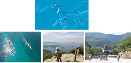 左:シーカヤックツーリング、中央:金田城山頂、右:朝鮮通信使行列 (©長崎県観光連盟)