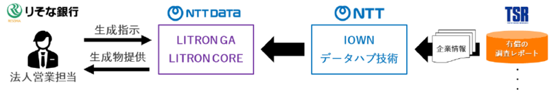 本実験では、NTTデータが提供する生成AIサービス「LITRON®」、NTTの「IOWN」を基盤としたデータハブ技術を活用し、TSRが長年培ってきた「TSR REPORT」と公知情報をAIの分析プロセスに組み込むことで、企業情報の収集・分析・レポート作成業務を自動化し、りそな銀行の法人営業担当者におけるコンサルティングの質の強化・業務負荷軽減、ひいてはお客様との対話時間の拡大に貢献することを目指します。