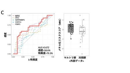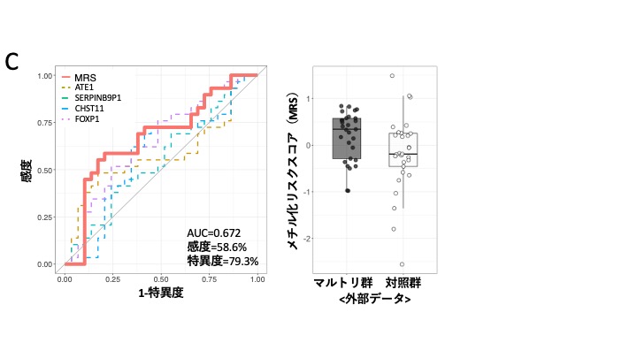 さらに、このメタ解析から絞り込まれたDNAの変化をもとにした「メチル化リスクスコア(MRS)注2」は、この研究とは独立した外部のデータセットにおいて、マルトリ経験の有無をこれらメチル化の値から一定の精度(AUC注9=0.672)で判別可能であった、という妥当性の検証も行っていることから、新しい生物指標(バイオマーカー)としての有用性も期待されます(図C)。将来的には、子どもを早期に社会的な支援につなげるためのスクリーニングツールや予防医学に発展することが期待されます。