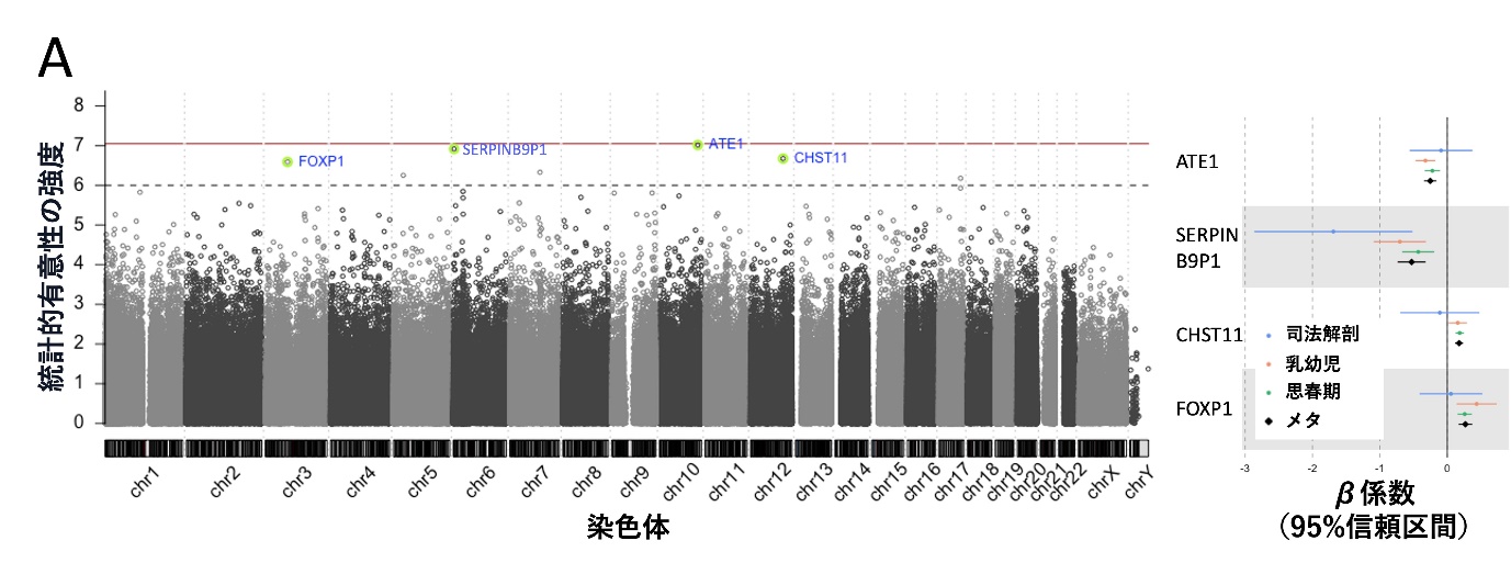 各集団を個別に解析した後、さらに3つの結果を統合したメタ解析を行い、マルトリ経験に共通して関連するメチル化部位(CpG部位)を探索しました。
