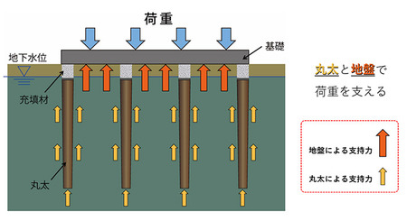本工法は軟弱地盤に丸太を圧入し地盤と丸太の双方で構造物を支える工法です(LP-SoC工法)。丸太は頭部を地下水位より深く設置し、腐朽や蟻害による生物劣化を防ぎます。圧入した丸太頭部を特殊な粘土で覆い地下水位の増減による影響を回避し、丸太頭部から基礎までを充填材(砕石)で締固め埋め戻します。