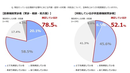 生理前・生理中に症状があり、対処している女性に対して、現在の対処法の満足度を聞いたところ、「医療機関を受診している・処方薬をもらっている」女性の78.5%が「満足」と回答しました。医療機関を受診することによって、それぞれの悩みや体質にあった適切な対処をとれているであろうことが伺えます。
