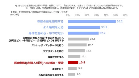 一方、「医療機関(産婦人科等)への相談・受診」は10.8%と、約1割に留まっていることがわかりました。女性たちの悩みが多様である一方で、対処法には偏りがあることが伺えます。