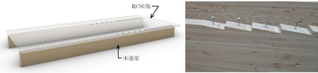 ※1 シアキ―(shear key)とは建築や土木分野で使われる構造部材におけるせんだん力(ずれるように働く力)の伝達要素。 今回の合成梁は、梁に曲げがかかった時に起こる水平方向のせんだん力を木質梁だけでなくRC床版にもシアキ―を介して伝達することで木質梁とRC床版が一体的に挙動する合成構造となる。