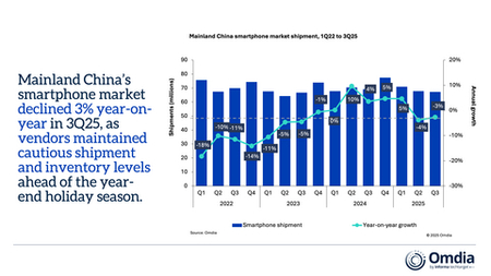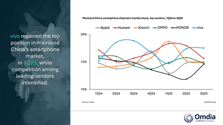オムディア:中国本土のスマートフォン市場が2025年第3四半期に3%縮小、競争激化のなかVivoが再びトップの座に