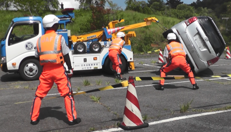中国5県のJAFロードサービス隊員が技術力を競い合う「クルマのお助けヒーロー決定戦」をはじめ、全国大会に出場した隊員による横転車両の引き起こし作業の実演。
