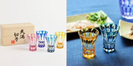 1933年創業の老舗ガラス工房「天満切子」の職人が手掛ける、本モール限定のぐい呑みペアセットです。透明度の高いレッドクリスタル24%に、「天満切子」の特長である蒲鉾彫り(U字掘り)を施しました。朝顔の花が咲く様子をイメージした柄が描かれ、飲み物を注ぐと光の屈折で底から模様が浮かび上がり、まるで万華鏡のような美しさが魅力です。