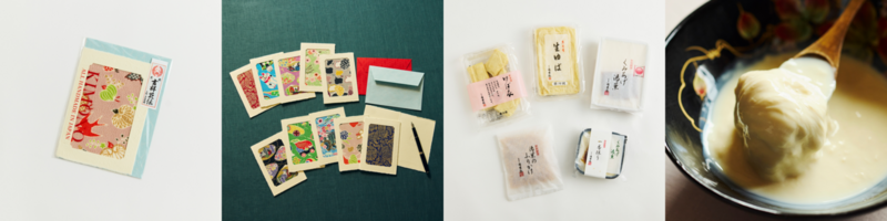 その他、京都府からは職人技と伝統文化を受け継ぐ逸品として、300年以上の歴史を持つ絹織物「丹後ちりめん」を使用したグリーティングカード「吉祥花伝KYOTO」や、帝国ホテル 第3代総料理長 杉本 雄も絶賛の希少な「くみあげ湯葉一番採り入りセット」なども展開中です。