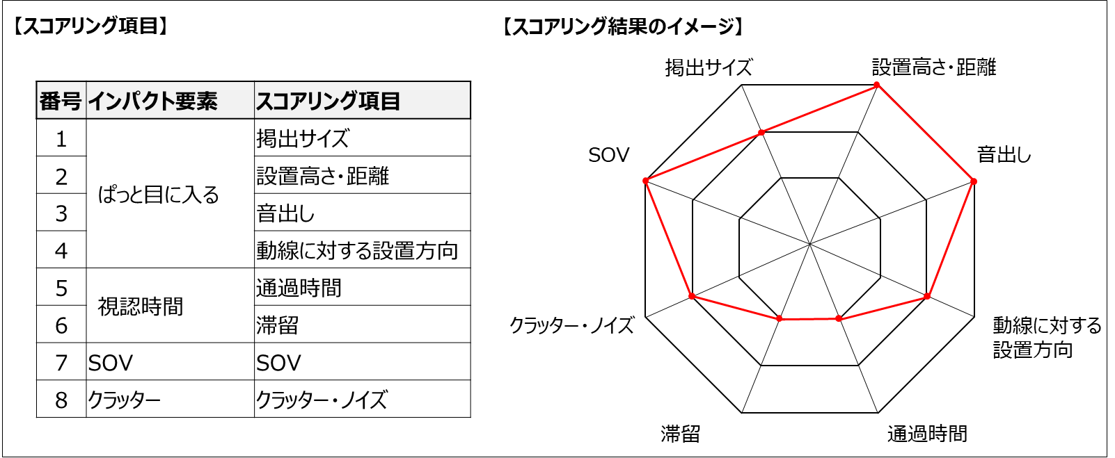 具体的には、広告への接触回数を計測するアクチュアル計測※5および、お客さまの広告へのイメージや広告の設置位置、掲出サイズなどの視聴者への影響度合いなど、広告へのインパクトを定量的に計測し、これら2つの計測結果をもとに効果測定を行いました。