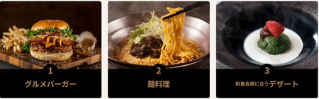 ① グルメバーガー/20名 ② 麺料理/20名 ③ 和食会席に合うデザート/20名 |
