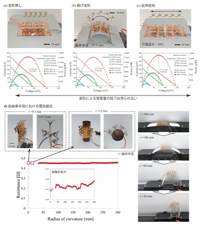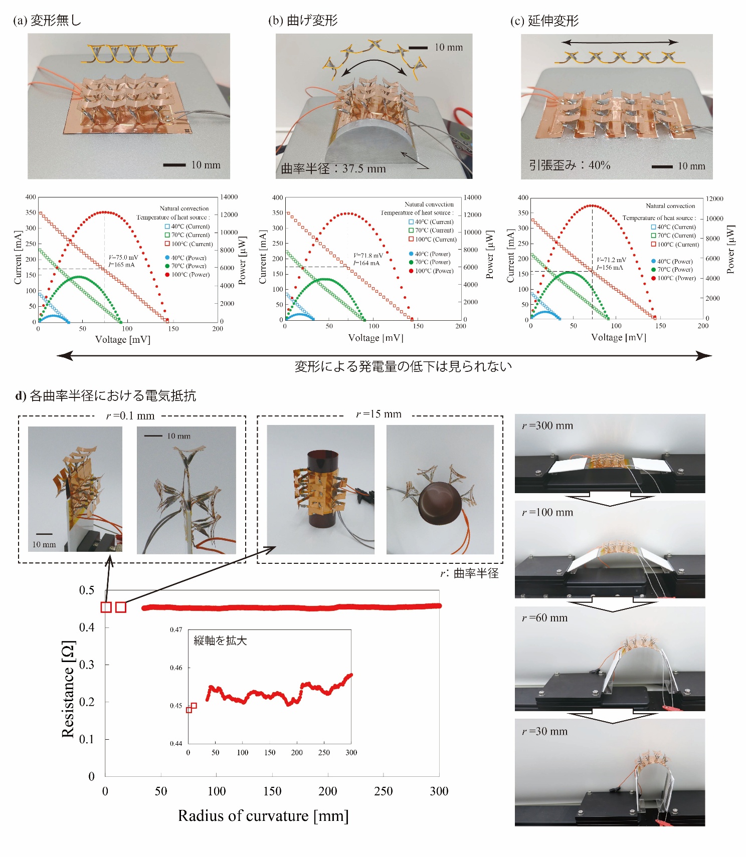 性能評価の結果、曲げや延伸といった変形を加えても、フラットな状態と同等の発電性能を維持できることを確認しました。また、曲率半径0.1mmの屈曲変形や1.7倍に伸ばす延伸変形が可能であることを示しました(図2)。したがって、緩やかに曲がった熱源のみならず、90度に曲がった角を持つような熱源であっても貼付可能です。