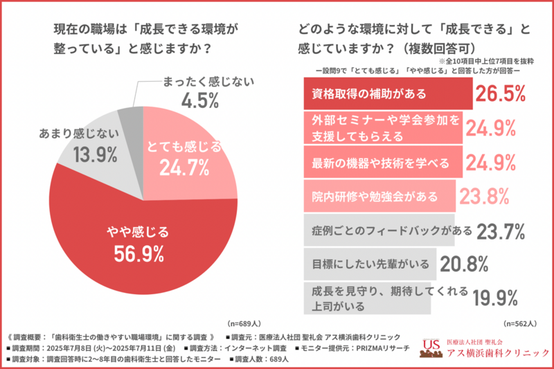 最後に、「どのような環境を「成長できる」と感じているか」について尋ねたところ、『資格取得の補助がある(26.5%)』が最も多く、『外部セミナーや学会参加を支援してもらえる(24.9%)』『最新の機器や技術を学べる(24.9%)』『院内研修や勉強会がある(23.8%)』と続きました。