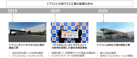 両社は、協業第一弾として、2019年12月に着工したトプコンの製造子会社である株式会社トプコンオプトネクサス(福島県田村市)の工場の建設工事では、敷地測量や基礎工事などの各工程において、BIMを用い、トプコンのデジタル測量機器やICT自動化施工技術を導入。その結果、現場作業の省力化、生産性が大幅に向上し、BIMと建設工事現場の連携に向けた実践的な取り組みの有効性が実証されました。