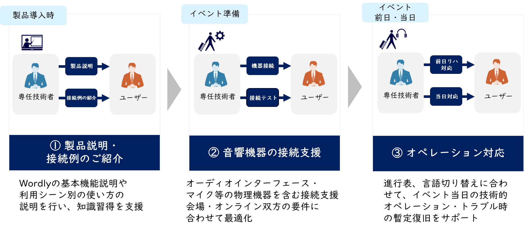 そこで、三井情報は配信技術に強みを持つフリートと業務委託契約を締結し、Wordlyの導入から機材接続の設計・検証、リハーサル立会い、当日の運用まで、一気通貫した支援を行う本サービスの提供を開始しました。本サービスを通じて、企業は通訳者の手配に要する準備期間やコストを削減できるほか、音響・映像機器の安定運用と、トラブル時の迅速な対応を実現します。その結果、参加者に快適なリアルタイム翻訳環境が提供でき、イベント全体の満足度向上につながります。