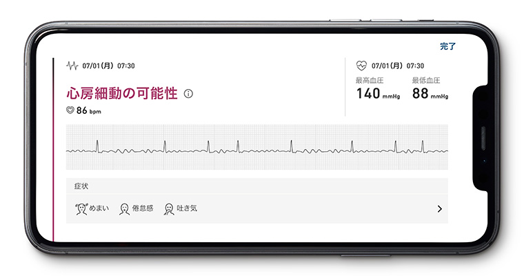 アプリ画面イメージ(心房細動の可能性を表示)