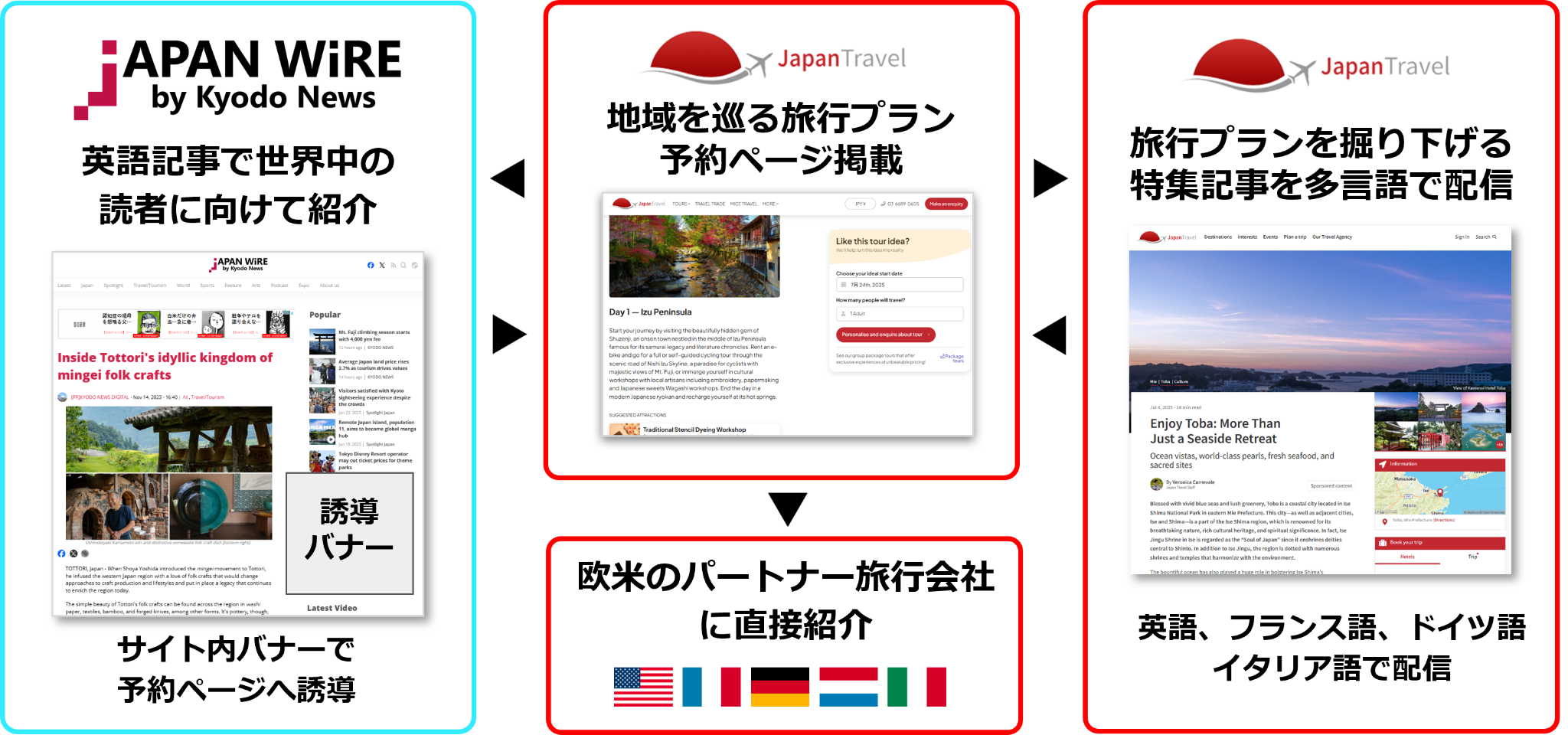 本サービスでは、一般社団法人共同通信社の英語ニュースサイト「Japan Wire」において、地域の文化・自然・歴史等の魅力を包括的に紹介する特集記事広告を発信します。あわせて、ジャパン・トラベルの外国人ガイドが対象地域を訪問し、旅行者目線による旅行プランを作成。これらのプランは、予約機能を備えた専用ウェブサイトに掲載するほか、ジャパン・トラベルが連携する欧米の旅行事業者にも提供され、訪日観光客の誘致につながる導線を構築します。