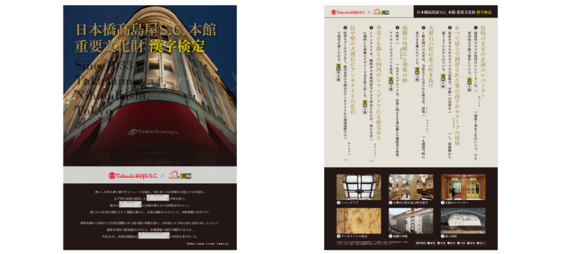 また、本展示の開催に合わせ、日本橋髙島屋と日本漢字能力検定(以下、漢検)のコラボレーション企画として『日本橋髙島屋S.C.本館 重要文化財漢字検定』を作成しました。特別展示開催期間中、日本橋髙島屋S.C.本館で無料配布を行うほか、漢検ホームページでもダウンロードいただけます。