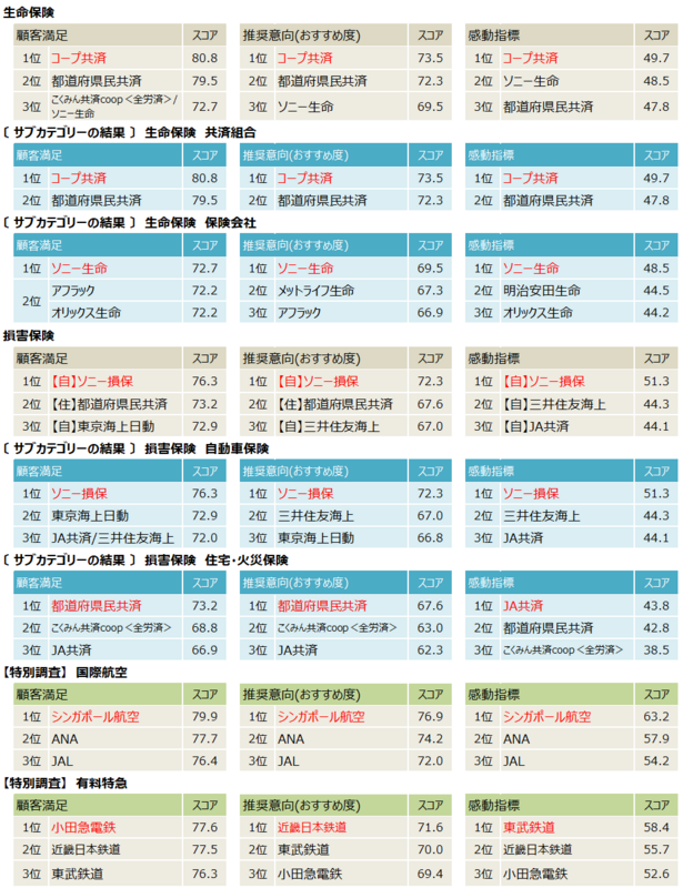 【自動車保険】(8) あいおいニッセイ同和損保、SBI損保、JA共済、ソニー損保、損保ジャパン、SOMPOダイレクト、東京海上日動、三井住友海上 (*ランキング対象外:こくみん共済coop <全労済>、 チューリッヒ、三井ダイレクト) 【住宅・火災保険】(7) あいおいニッセイ同和損保、こくみん共済coop <全労済>、JA共済、損保ジャパン、 東京海上日動、都道府県民共済、三井住友海上
