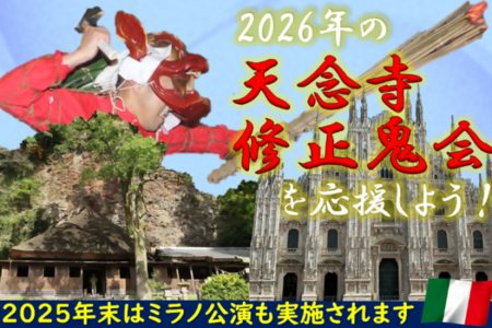 なお、本公演では、会場で天念寺修正鬼会のPRを行うだけでなく、イタリアやミラノ市の行政関係者や、旅行エージェント、学術関係者との関係づくりを行い、修正鬼会本番における旅行商品造成までを目指します。