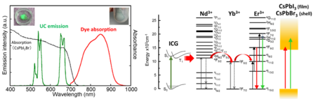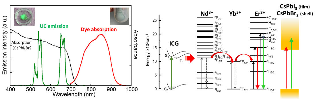 図3 左:色素増感型アップコンバージョンナノ粒子の吸収と発光特性。 発光波長はペロブスカイト層の吸収と一致する。 右:エネルギーダイアグラム。ペロブスカイト層内に置いて、 色素→希土類→ペロブスカイトという多段階のエネルギー移動が生じる。