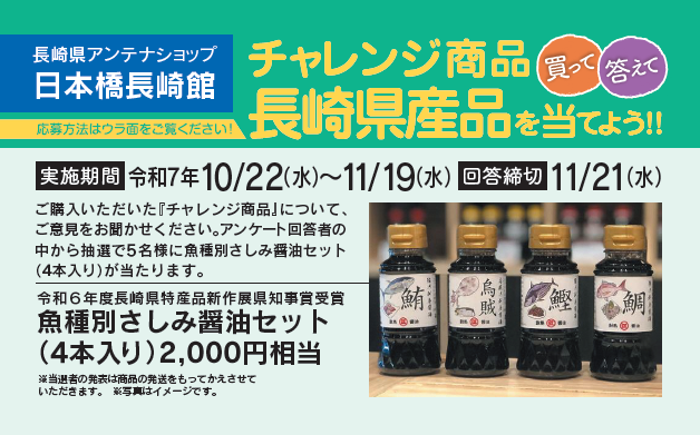 長崎県は、東京・日本橋にある長崎県アンテナショップ「日本橋 長崎館」(東京都中央区)の重要な機能の一つである「情報受信機能の強化」を図るため、県内事業者が製造した新商品・首都圏未取引商品などのチャレンジ商品コーナーを設置し、首都圏の消費者ニーズなどを収集する「テストマーケティング」を実施します。
