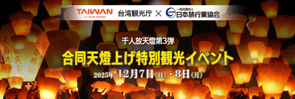 台湾観光庁は、日本旅行業協会(JATA)とのコラボにより「2025 合同天燈上げ特別観光イベント(千人放天燈)」を2025年12月7日(日)および8日(月)の2日間、台湾・十分特設会場にて開催します。