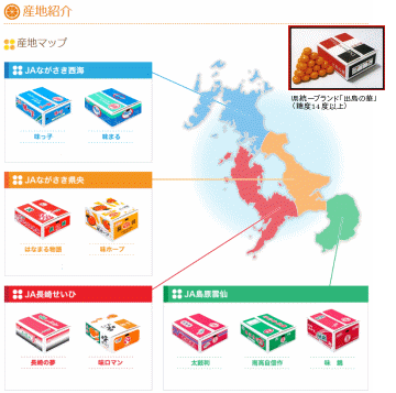 長崎県内には主に4つのみかん産地があり、各地域の気候や土壌に合わせた栽培管理により、糖度13度以上のみかん(長崎の夢:JA長崎せいひ、はなまる物語:JAながさき県央、太鼓判:JA島原雲仙、味っ子:JAながさき西海、)や糖度12度以上のみかん(味ロマン:JA長崎せいひ、味ホープ:JAながさき県央、味錦:JA島原雲仙、味まる:JAながさき西海、)など、糖度にこだわったブランドみかんを生産しています。