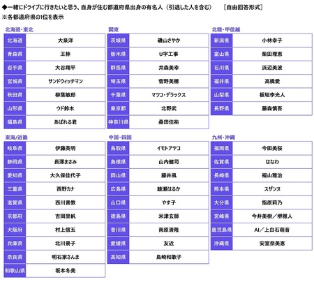 一緒にドライブに行きたい自県出身の有名人 都道府県別の1位は?