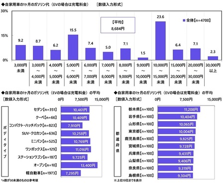 全回答者(4,700名)に、自家用車の1ヶ月のガソリン代(EVの場合は充電料金)を聞いたところ、「10,000円~15,000円未満」(23.6%)に最も多くの回答が集まったほか、「5,000円~6,000円未満」(15.5%)にも回答が集まり、平均は8,684円でした。