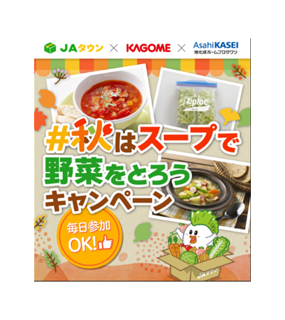 JA全農が運営する産地直送通販サイト「JAタウン」は、カゴメ株式会社、旭化成ホームプロダクツ株式会社との共同企画として、10月30日(木)から11月19日(水)まで、「秋はスープで野菜をとろう!Xキャンペーン」を実施します。