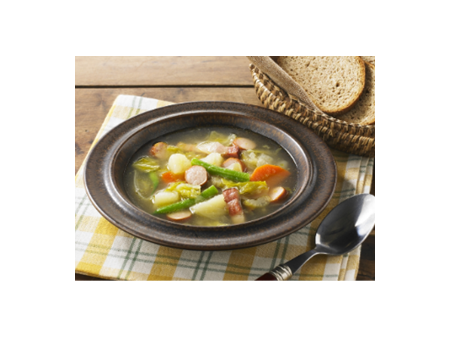べーコンや玉ねぎ、にんじん、セロリ、じゃがいも、キャベツを炒め、「カゴメトマトピューレー」で煮込んだミネストローネです。