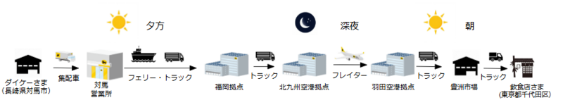 ■輸送例:長崎県対馬市の水産事業者「株式会社ダイケー」さまから東京都内の飲食店さまに活魚を輸送