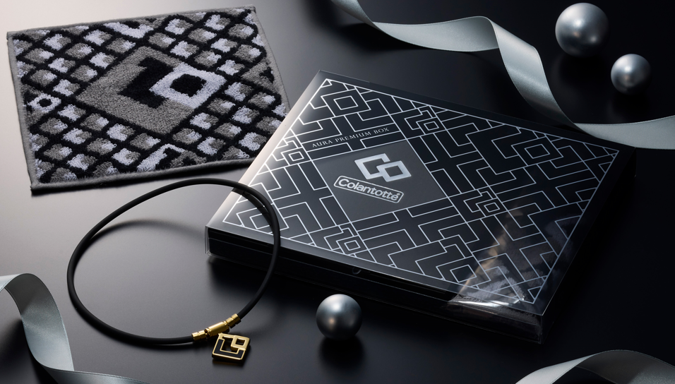 コラントッテ TAO ネックレス AURAをプレミアム仕様のBOXにて数量限定で販売します。サイズはLもしくはLL、カラーはプレミアムゴールド/シルバー/マットブラックの3色からお好きなものをお選びいただけます。さらにAURAのデザインをモチーフにしたオリジナルハンドタオルがセットになった豪華仕様で特別な贈り物としておすすめです。
