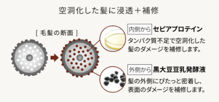 セピアプロテインと黒大豆豆乳発酵液がダメージで空洞化してしまった髪に浸透し、内側と外側からダブルで補修することが期待されます。