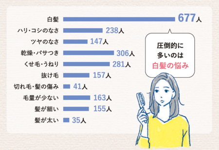 当社に寄せられる髪の悩みは様々ありますが、お客さまアンケートで最も多かった悩みは「白髪」でした。