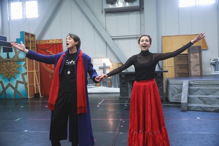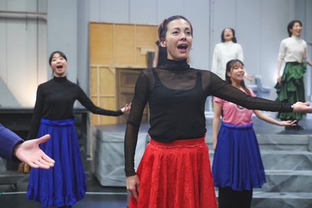 最初に公開されたシーンは、過去のクリスマスの精霊に導かれたスクルージが、青年時代の自分が愛する女性イザベラにプロポーズをする瞬間を見て、若き日の愛情をよみがえらせるシーン。欲ではなく、愛に満ちていたかつての自分を見つめるスクルージの心震える様子を繊細に演じる吉田栄作。土屋アンナの優しく温かな歌声もとても新鮮だ。続いては、時間旅行を終えたスクルージと、吉田要士が扮する親友マーレイが歌うクライマックスのシーンへ。ふたりの絆を感じさせる豊かな歌声が稽古場に響いた。そして全キャストがクリスマスナンバーにのせて歌い踊る楽しいカーテンコールが披露された。