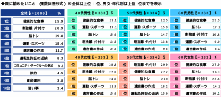 男女・年代別にみると、50代女性では「断捨離・片付け」が1位、「運転免許証の返納」が5位に挙がりました。