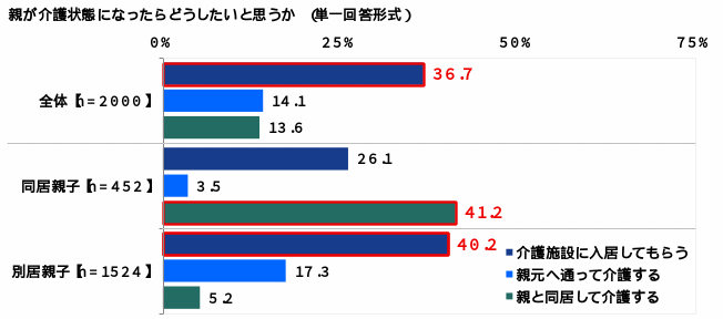 親が介護状態になったらどうしたいか聞いたところ、「介護施設に入居してもらう」が36.7%、「親元へ通って介護する」が14.1%、「親と同居して介護する」が13.6%となりました。老人ホームやサービス付き高齢者向け住宅といった施設に入居してもらうことを希望する人が多いようです。