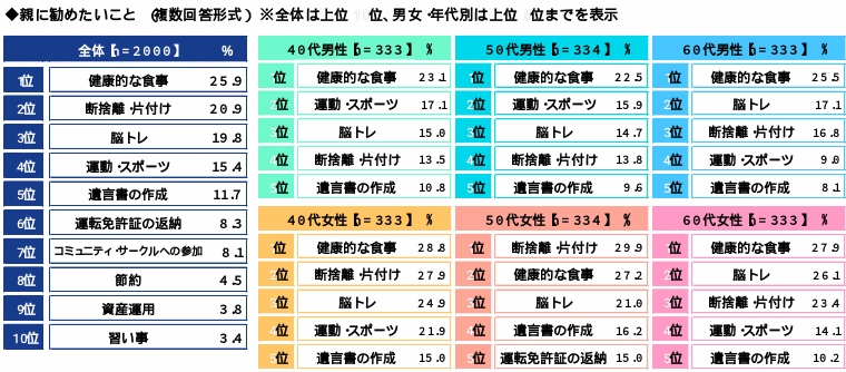 ■親に勧めたいこと 1位「健康的な食事」2位「断捨離・片付け」3位「脳トレ」