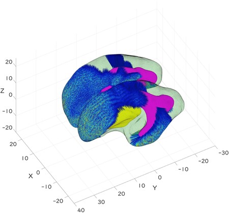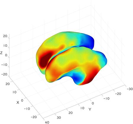 図 3. モデル2を用いてニューロンの移動量を示した。赤で示した領域は、多くのニューロンが移動することを示している。シルビウス溝周辺領域と、前頭葉のない側面にそのような領域が集中している。