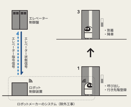 ロボットの制御装置とエレベーターを専用信号で接続することにより、ロボット乗車時はロボット専用エレベーターとしての運用が可能です。(有償付加仕様)