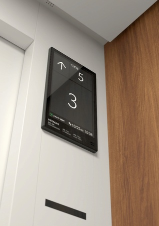 アーバンエース HF Miraiのかご内には、従来モデルのサイズ(8.4インチ)より大きい12.1インチの大型液晶インジケーターを採用します。壁面から独立したデザインにより視認性が向上し、見やすくわかりやすい情報提供を実現します。また、緊急時の4カ国語表示や機能アイコン*3、ニュース*3や天気予報*3など、多様なコンテンツを通じて、安心・快適な移動をサポートします。
