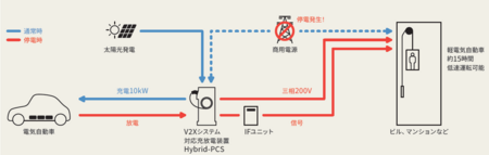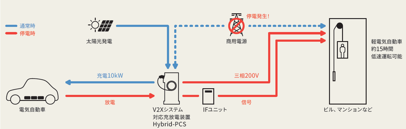 平常時は、EV用の急速充電器として機能し、災害時は、EVのバッテリーによってエレベーターを稼働できるほか、給排水、空調、照明などのビルインフラに電力の供給をすることも可能です。(有償付加仕様)