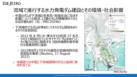 ・主な対立は、最上流国である中国と下流の東南アジア諸国との間に存在。中国は本流域で、ダム開発や水路掘削のための拡張工事、都市開発を進めてきた