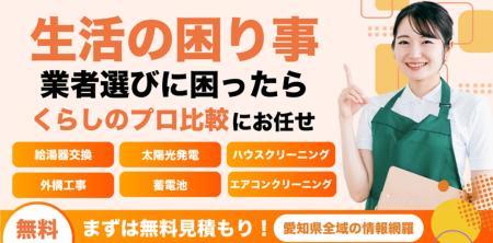 『愛知くらしのプロ比較』は、エアコンクリーニングやハウスクリーニングのほか、 給湯器交換、蓄電池、太陽光発電など、ご家庭のさまざまなニーズに対応する業者を比較検討できるメディアです。