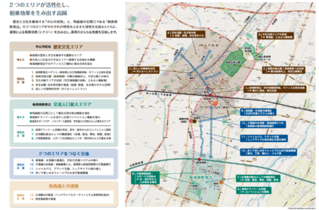 当所議員で構成する5つの常任委員会における議論を通じて導き出した“10のテーマ”を軸に、「中心市街地・高岡駅周辺(歴史文化エリア)」と「新高岡駅周辺(交流人口拡大エリア)」を都市の二核として位置づけ、双方を結ぶアクセスや機能の強化策等をはじめとした14の方策を提案しています。