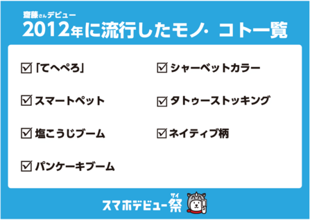-Q お二人がデビュー当時に流行ったもの・ことの一覧です。 この中で印象に残っている言葉はありますか?