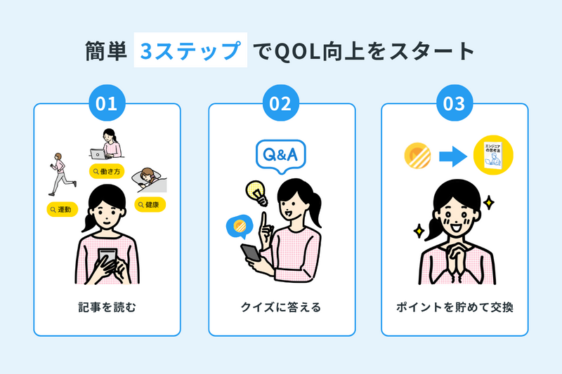 「何をすればQOLが高まるか分からない」「情報収集の時間がない」といったお悩みの方へ。ITエンジニアのライフスタイルに寄り添った記事コンテンツと、記事内容から作成されたクイズを用意しました。簡単なクイズに回答することで、QOL向上につながるヒントを短時間で楽しくインプットできます。