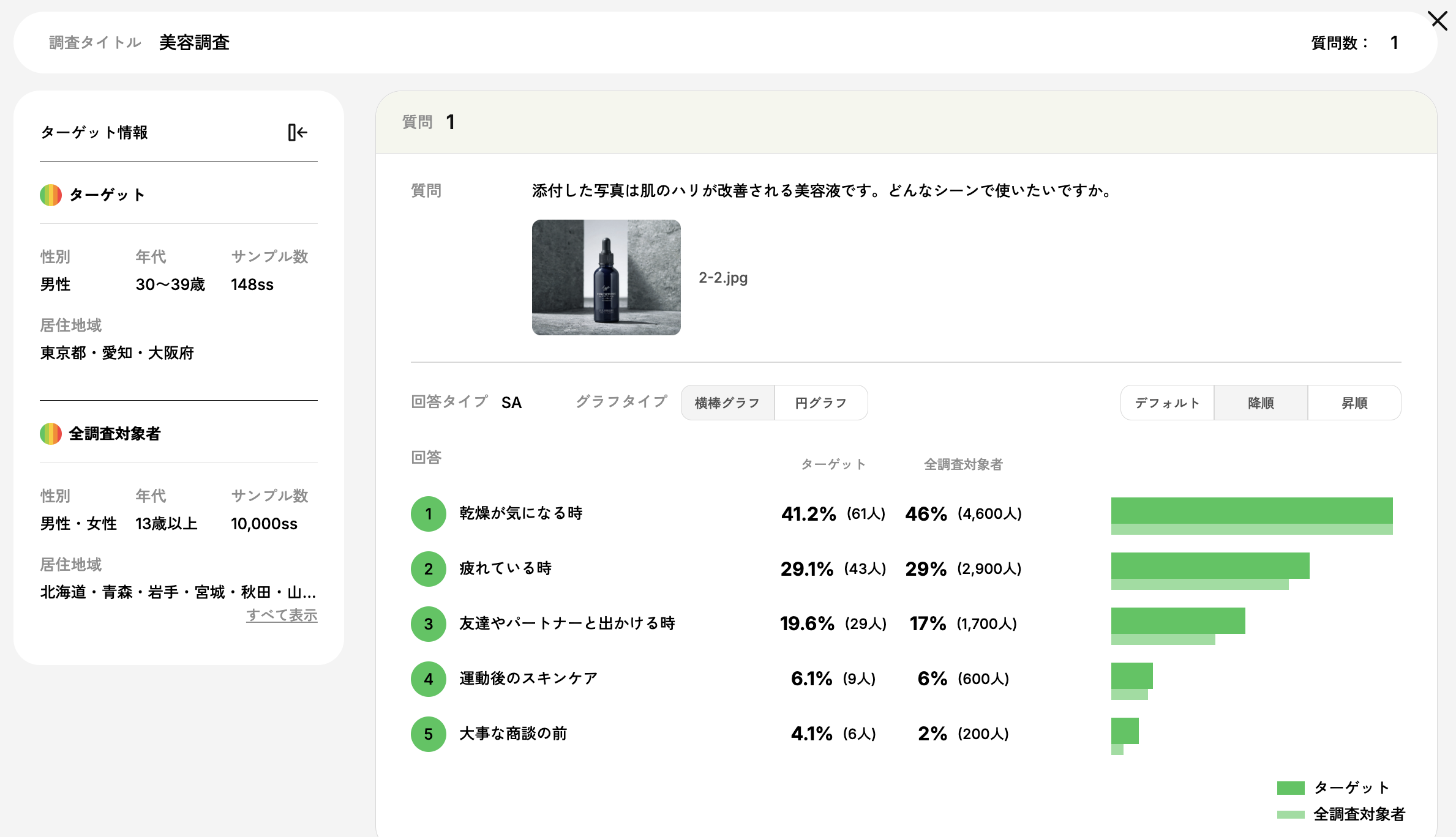 任意の質問を設定し、その回答結果をもとに、より詳細な分析を行いたいセグメントの抽出が可能です。従来のFA(単一回答)や、SA(自由記述回答)に加え、MA(複数回答)形式の設問にも対応します。MA形式では、複数の選択肢の中から該当するものを複数選ぶことができ、より柔軟で実態に即した調査設計を可能にしたため、生活者の多面的な価値観や行動をより正確に捉えることができます。